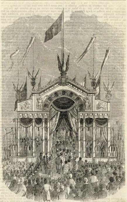 Na imagem, gravura do Pavilhão Real onde a Câmara Municipal de Lisboa entregou as chaves da cidade ao rei D. Luís I, publicada no “Archivo pitoresco; semanário ilustrado”, n.º 44, de 1861.