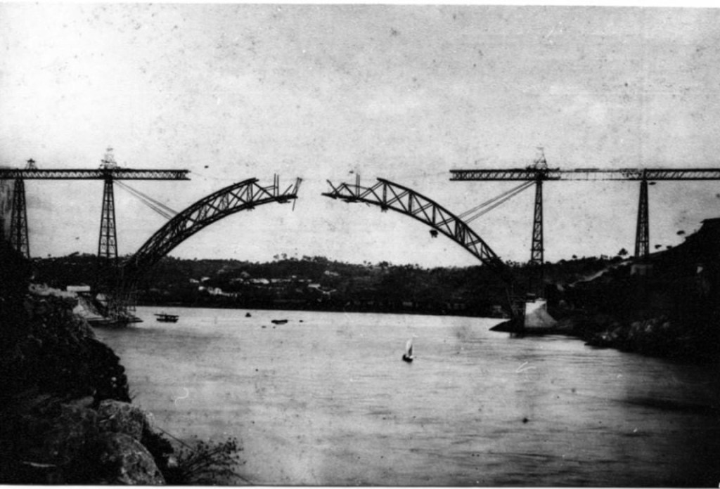 Na imagem, uma fotografia da época da construção da ponte onde se pode ver o arco ainda por fechar (Arquivo Municipal do Porto).