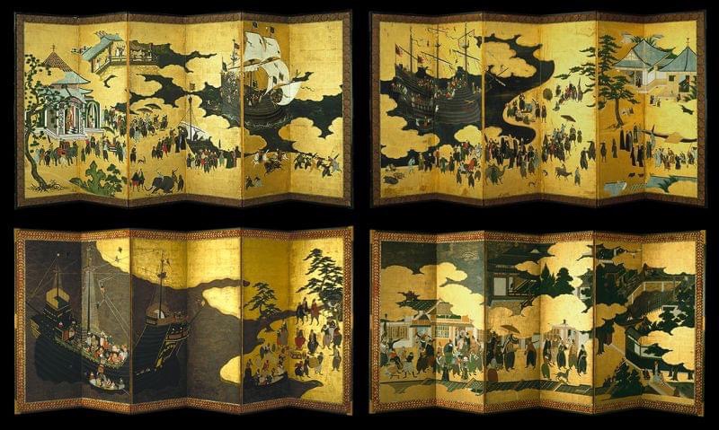 Na imagem, dois pares de biombos namban, onde podemos ver o encontro de civilizações ocorrido nos séculos XVI e XVII aquando da presença portuguesa no Japão (MNAA).