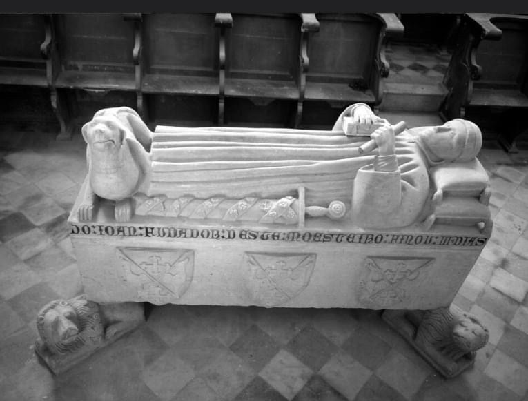 Nele se pode ler: “Aqi jaz joan da regas caualeiro doutor em leis priuado del rei dom joan fundador deste mosteiro finou III dias de maio era MIIIC XLII anos”.