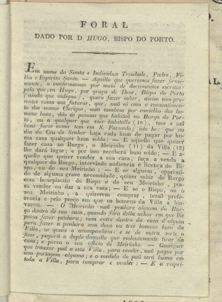 Na imagem, a primeira página da tradução do Foral que foi publicado na cidade do Porto, em latim e português, pela Tipografia de Viúva Alvarez Ribeiro e Filhos, em 1822.