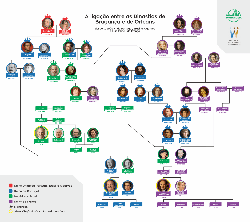 No último infográfico que preparamos, destacamos os laços de consanguinidade entre a Família Real de Portugal e a Família Imperial do Brasil. Nesse novo infográfico, evidenciamos aos nossos seguidores a estreita ligação entre as Dinastias de Bragança e de Orleans, que se pode notar tanto no que respeita ao ramo original da Casa de Bragança (português), quanto no que tange ao ramo brasileiro.