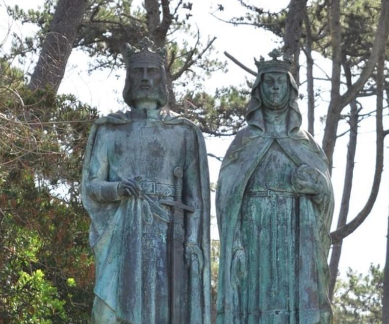 Na imagem, conjunto escultórico com as estátuas do Rei D. Dinis e da Rainha Santa Isabel erguido junto ao Pinhal de Leiria, à entrada de São Pedro de Moel.